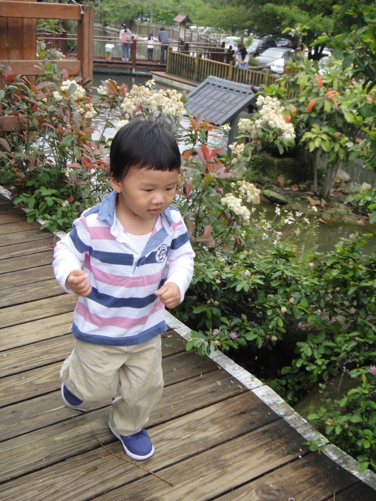 停車場旁邊馬上就是一個大池塘,全全跟圓圓很開心地餵魚