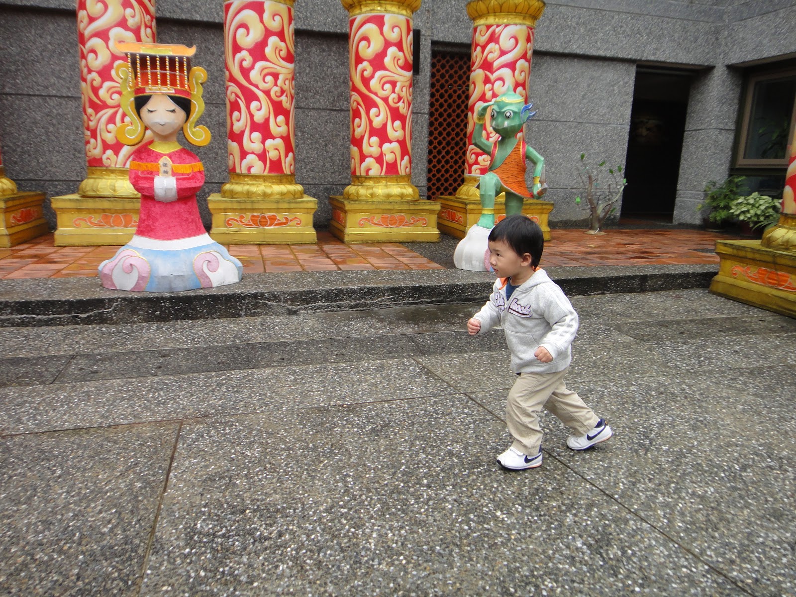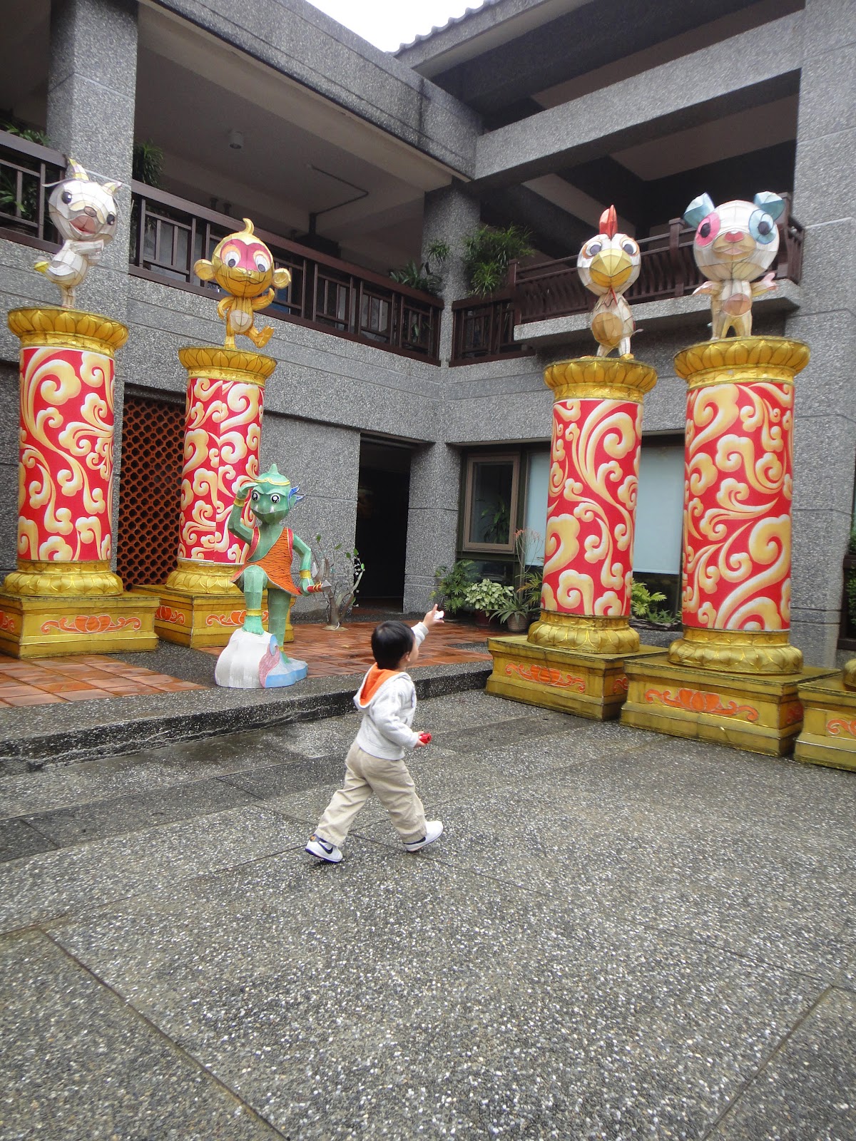 不過中庭裡有十二生肖的大型展示品,我們就問全全老鼠在那裡,他就衝向老鼠得意地比給我們看,光是這樣衝來衝去就玩了十幾分鐘